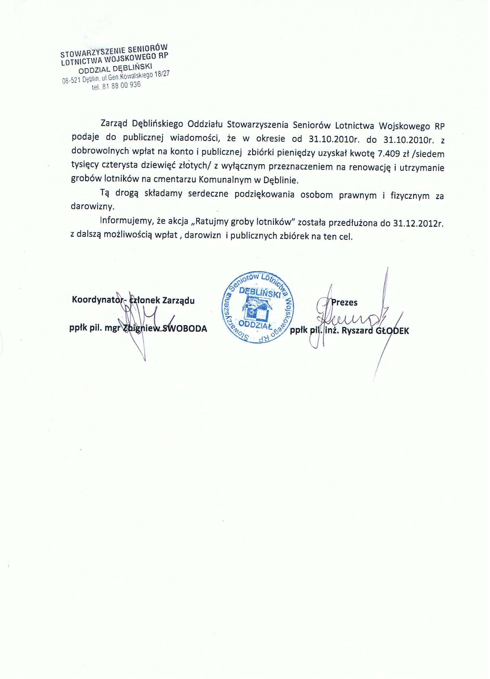 Organizatorzy z Oddziału Dęblińskiego Stowarzyszenia Seniorów Lotnictwa Wojskowego RP, dziękują Społeczeństwu miasta Dęblina za ofiarność i.finansowe wsparcie naszej inicjatywy.